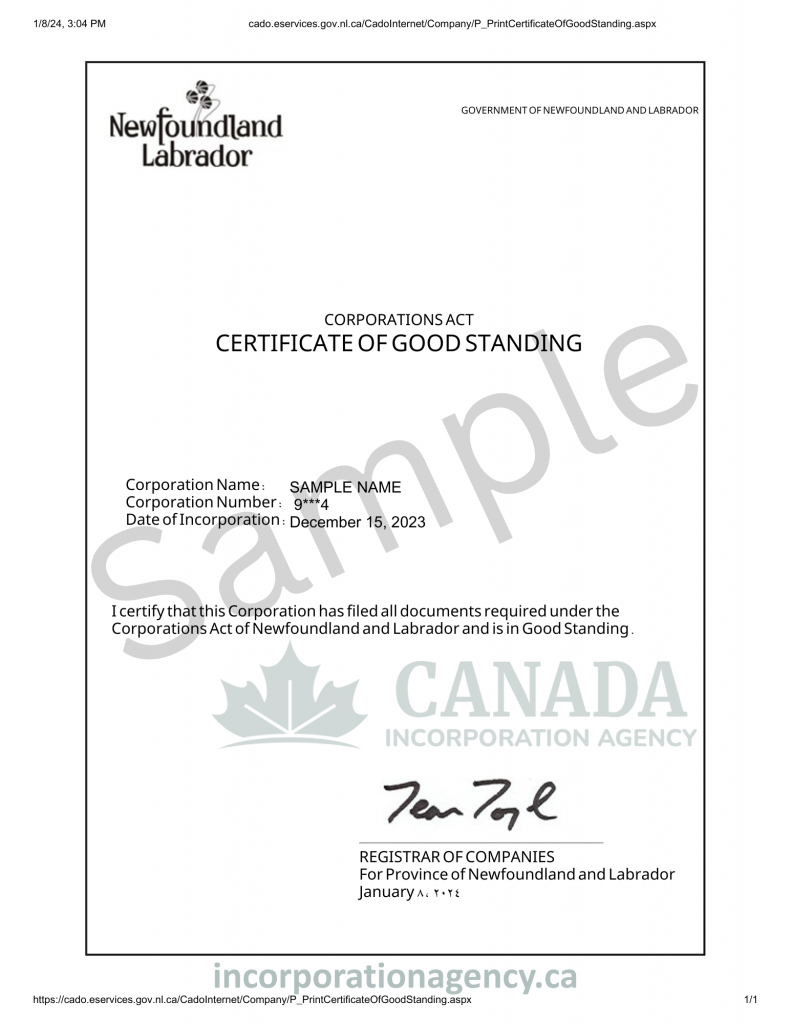 The certificate includes your corporation name, registration number, incorporation date, registered office address, current status confirmation, and verification that all required filings are current. Some jurisdictions also include director information, share capital details, and specific compliance confirmations.