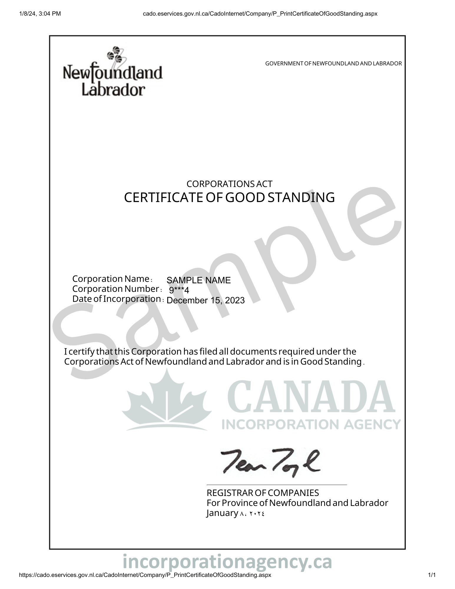 The certificate includes your corporation name, registration number, incorporation date, registered office address, current status confirmation, and verification that all required filings are current. Some jurisdictions also include director information, share capital details, and specific compliance confirmations.