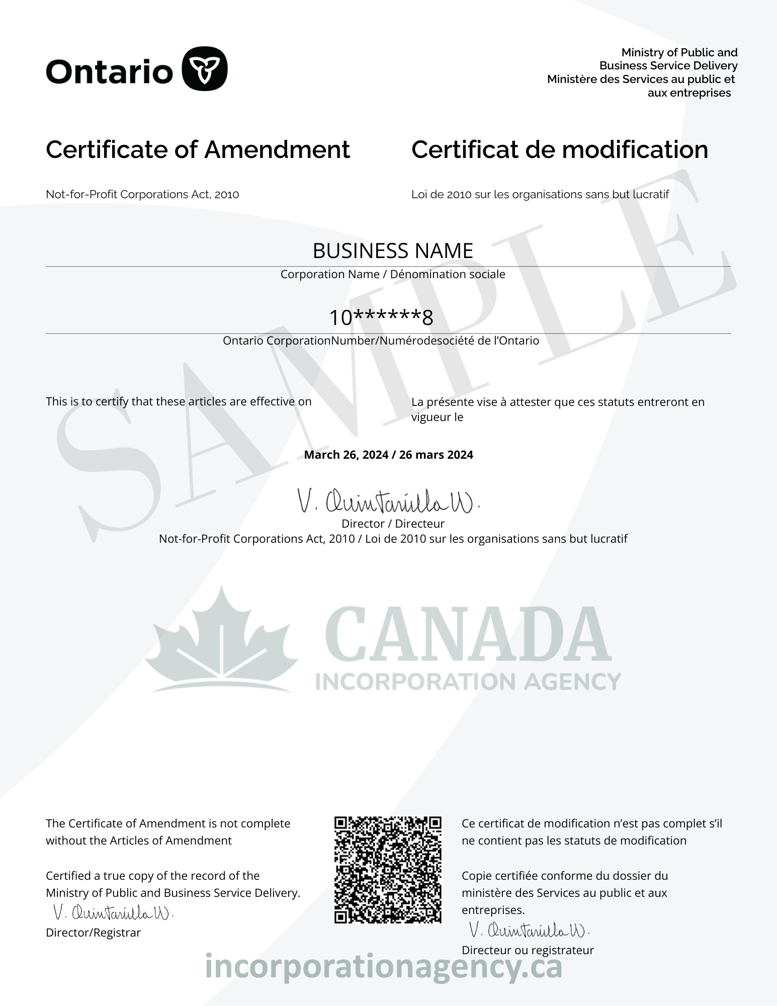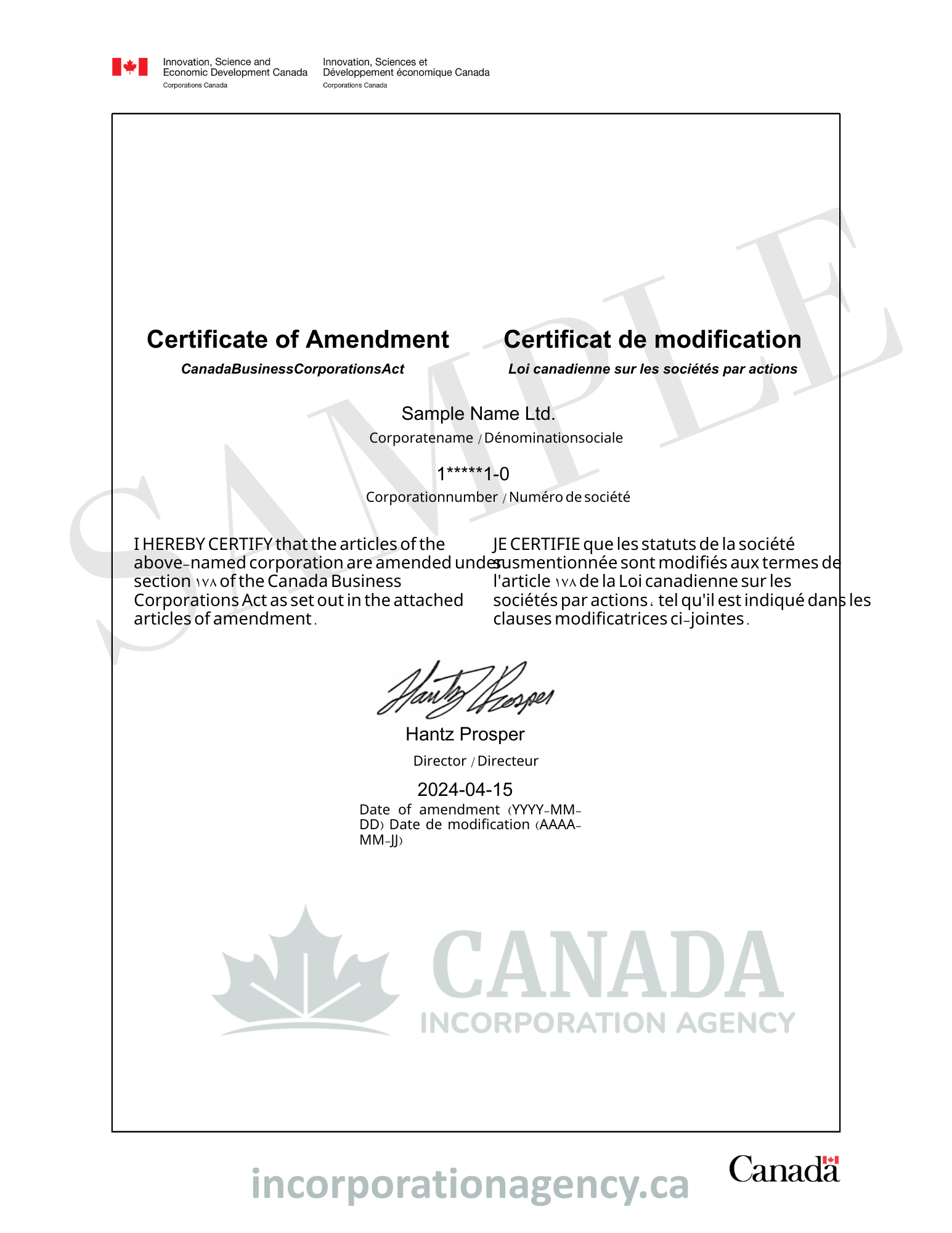 Articles of Amendment are official legal documents used to make formal changes to a corporation’s original Articles of Incorporation. They are filed with the corporate registry in the jurisdiction where the business is incorporated (Federal, Ontario, Alberta, etc.).