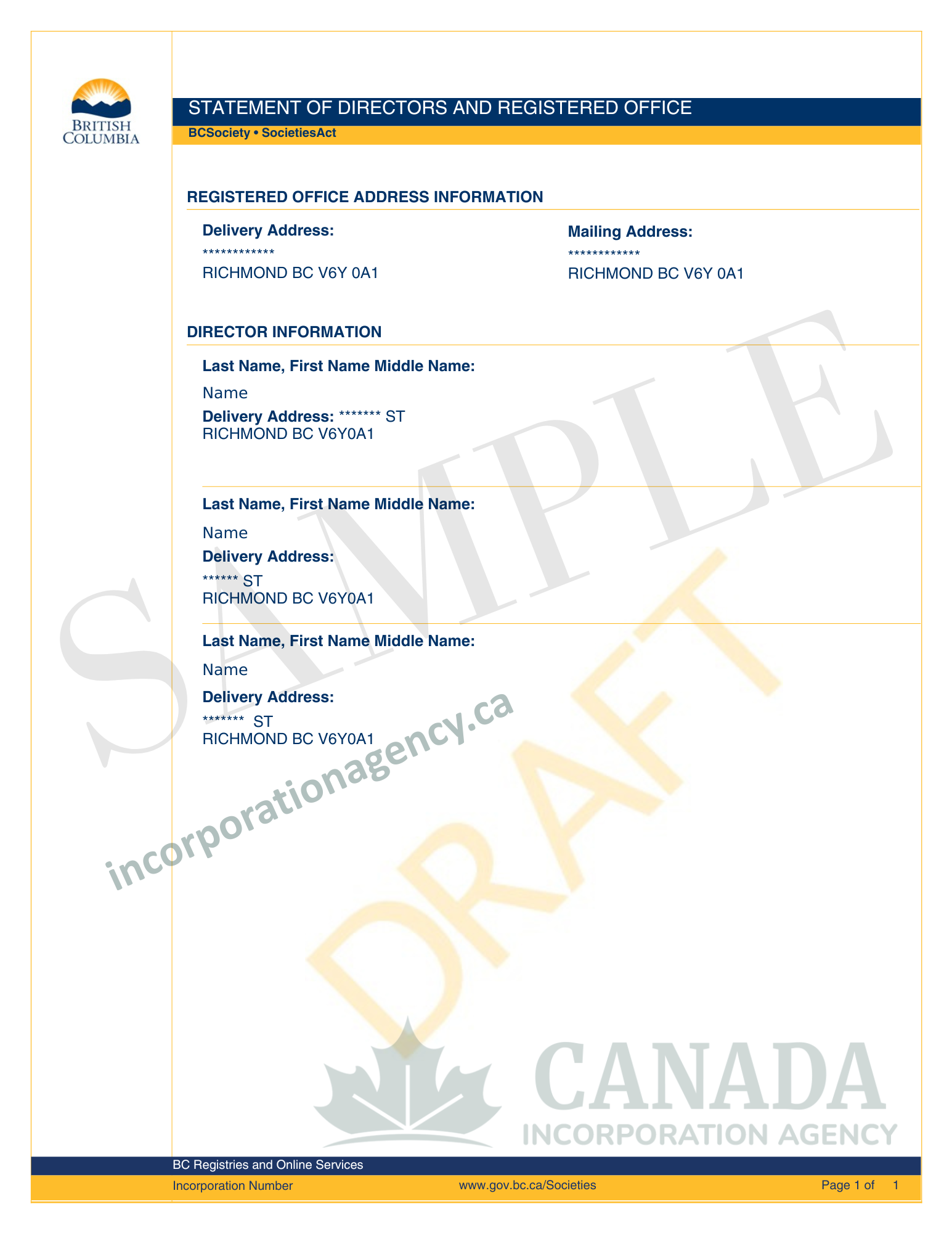 To register a Canadian corporation, a physical address in the local jurisdiction is required where the government sends documents, notices, and letters. Our agency offers such services throughout the country.
