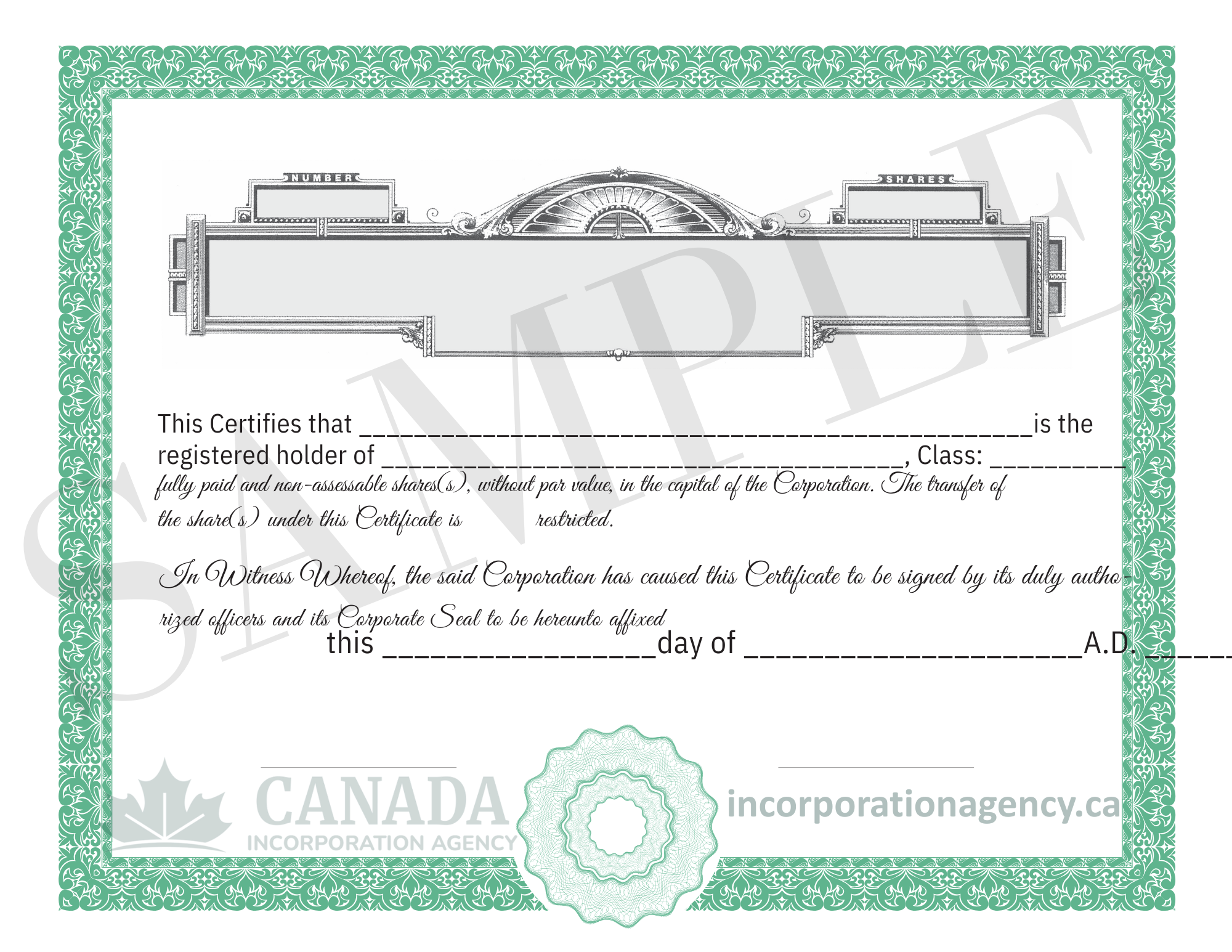 Whether you’re issuing shares for the first time or updating corporate records, Incorporation Agency offers fully customizable, professional share certificates that meet federal and provincial standards in Canada.